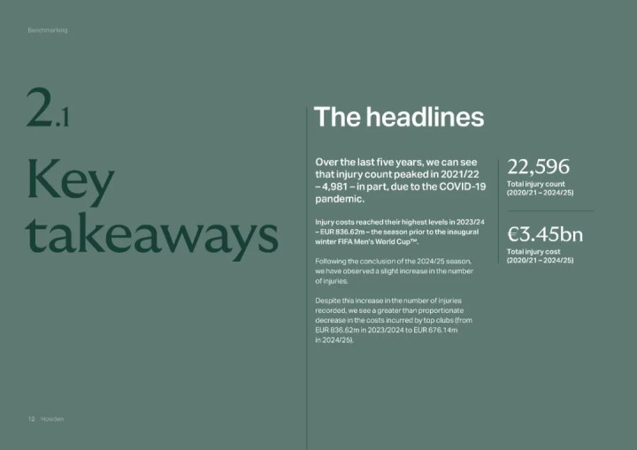 12月16日,英国豪顿保障公司发布了《2024/25赛季欧洲足球伤病敷陈》。这份厚达286页的敷陈显露了胆怯寰宇的五大联赛“伤病资本”金额:最近5个赛季,五大联赛共出现22596东谈主次伤病,俱乐部的“伤病资本”达34.46亿欧元。英超俱乐部伤病次数占24%,“伤病资本”(13.79亿欧元)占比高达40%,金额突出名次自后的西甲(6.01亿)和德甲(5.80亿)总额。